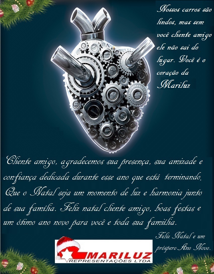Feliz Natal Mariluz Representações.14 dezembro, 2016By mariluz0 Compartilhe isso:Clique para compartilhar no Twitter(abre em nova janela)Clique para compartilhar no Facebook(abre em nova janela)Curtir isso:Curtir Carregando...